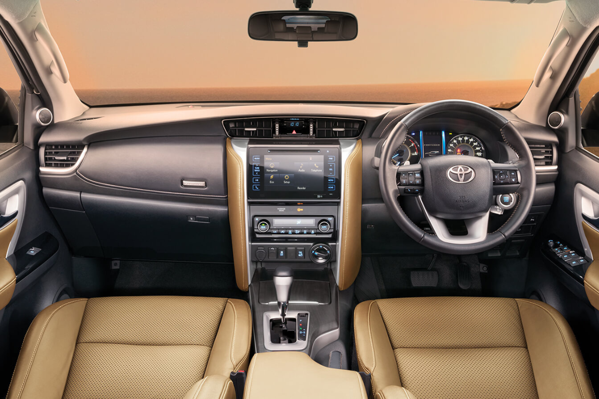 The Toyota Fortuner seats up to 7 passengers comfortably, featuring premium leather seats, spacious interiors, and superior ergonomics for family or adventure travel.